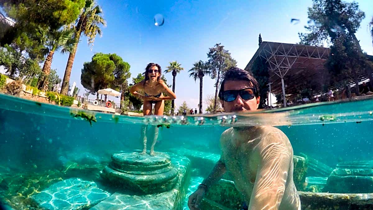 Burası milattan önce 2. yüzyıldan kalan Hierapolis kentindeki Antik Havuz, nam-ı diğer Kleopatra Havuzu. UNESCO koruması altında, Dünya Kültür Mirası Listesi’ndeki sit alanı Hierapolis Antik Kenti içinde, Pamukkale Travertenleri’nin hemen yukarısındaki alanda yer alıyor. Bu kadar kıymetli bir mirası, bu kadar özel bir şekilde deneyimlemek bizce müthiş bir tecrübe. Bu arada, ölmeden önce yapılacak şeyler listemizden böylece bunu da silmiş olduk!