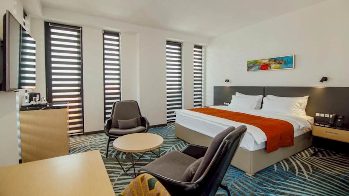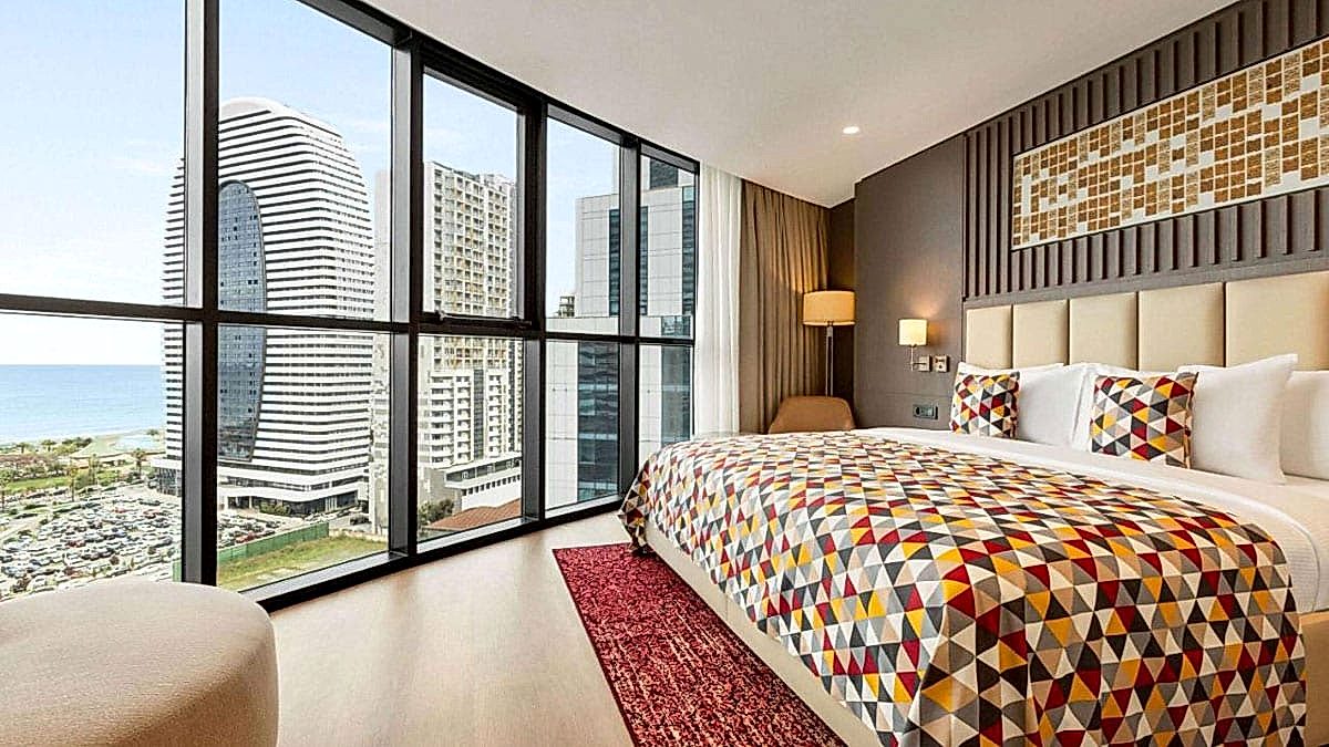 Batum Plajı’na yürüme mesafesinde bulunan Ramada Plaza by Wyndham Batumi & Casino bu bölgedeki beş yıldızlı konaklama seçenekleri arasında. Ücretsiz özel otoparkı, açık yüzme havuzu, fitness merkezi ve sauna gibi hizmetleri bulunmakta. Açık büfe ve alakart kahvaltısı da var. Odaları modern tarzda dekore edilmiş; klima, düz ekran tv, kettle, minibar ve özel banyo hepsinde bulunuyor. Çocukların ve evcil dostların konaklamasına uygun, bebek karyolası sağlanıyor. Oteli detaylı incelemek ve rezervasyon yaptırmak için tıklayın. Haritada 15 numara.