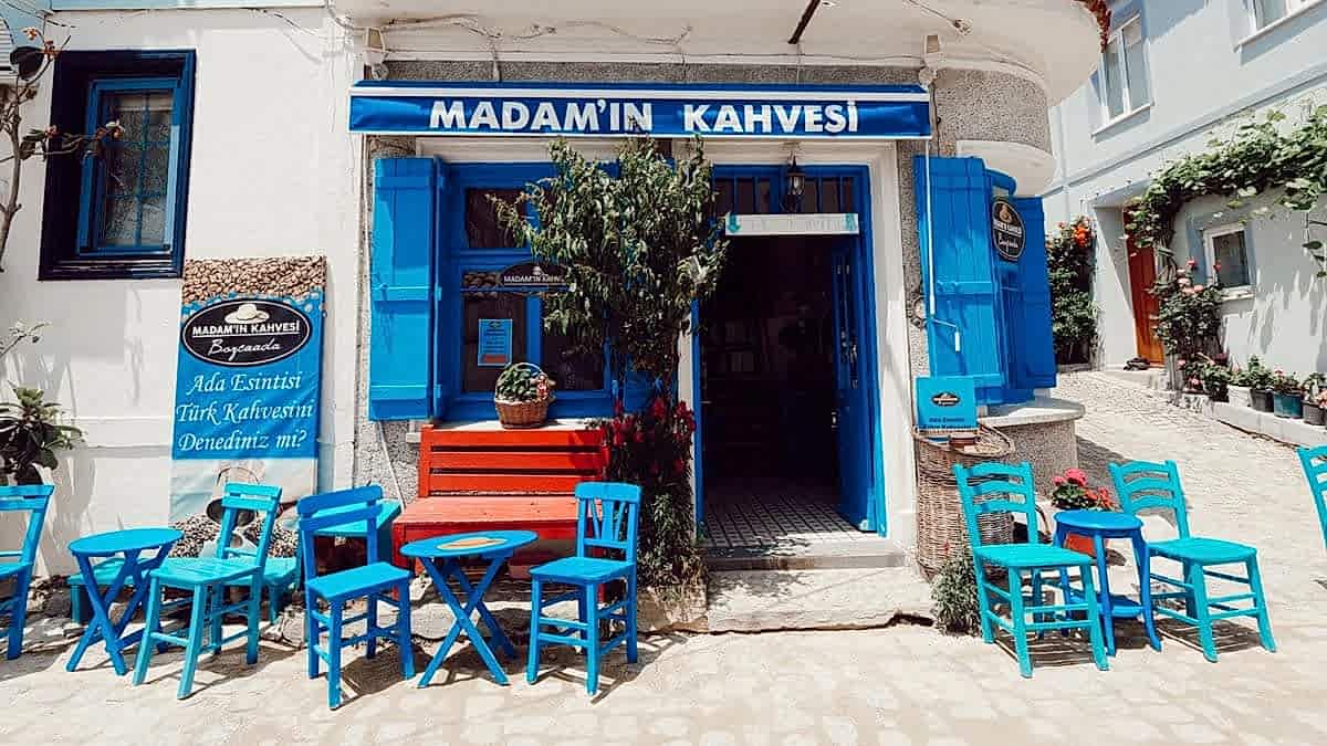 Arada çanın sesini duyacağınız Meryem Ana Kilisesi Rum Mahallesi’nin 1800’lerden kalma daimi sembolü. Rum Ortodoks cemaatine ait adadaki tek işlek kilise. Artık adada Rum nüfusun iyice azalması nedeniyle sadece pazar sabahları yapılan ayin için açılıyor ve yeniden kapısına kilit vuruluyor. Dolayısıyla içine girip gezemiyorsunuz. Yalnızca dışından kulesini fotoğraflamak mümkün. Ya da kilisenin gölgesine masa atan ve mütemadiyen kalabalık olan Madamın Kahvesi’nde birer sakızlı Türk kahvesi içebilirsiniz. için tıklayın. Haritada 3 numara.
