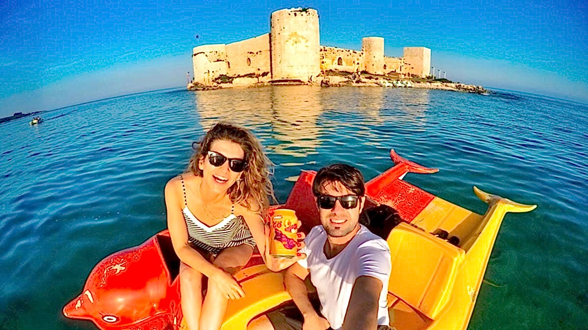 Mersin merkezden direksiyonu Erdemli ilçesine doğru kırınca, Erdemli merkezi 23 kilometre geçince karşınıza denizden 600 metre açıkta yükselen, Mersin’in Kızkulesi, Kızkalesi çıkıyor. Mersin’in Kızkulesi diyoruz çünkü hikaye olarak da karşımıza aynı olay örgüsü çıkıyor: Kralın kızı, kehanet, yılanlı sepet ve hazin son. Efsaneleri bir kenara bırakacak olursak bu yapının tarihinin Bizans dönemine uzandığı düşünülüyor. Denizin ortasında böyle bir kalenin yapılış amacı ise genel kanıya göre zamanında bir sahil şehri olan Korykos’u denizden gelebilecek ataklara karşı korumakmış. Kaleye ulaşmanın iki yolu var: Yüzmek veya bir deniz bisikleti kiralamak. Biz deniz bisikleti kiraladık ama Kızkalesi bölgesinin suyu o kadar berrak ve turkuaz ki yüzmek de içimizde kalmadı değil hani. Zaten kaleye varmak 10-15 dakika, gezmesi de bi 15 dakika kadar sürüyor. Yani 1 saatlik süre hayli hayli yetiyor da artıyor. Kızkalesi, Mersin merkeze yaklaşık 60 kilometre 1 saat mesafede. Konum için tıklayın.