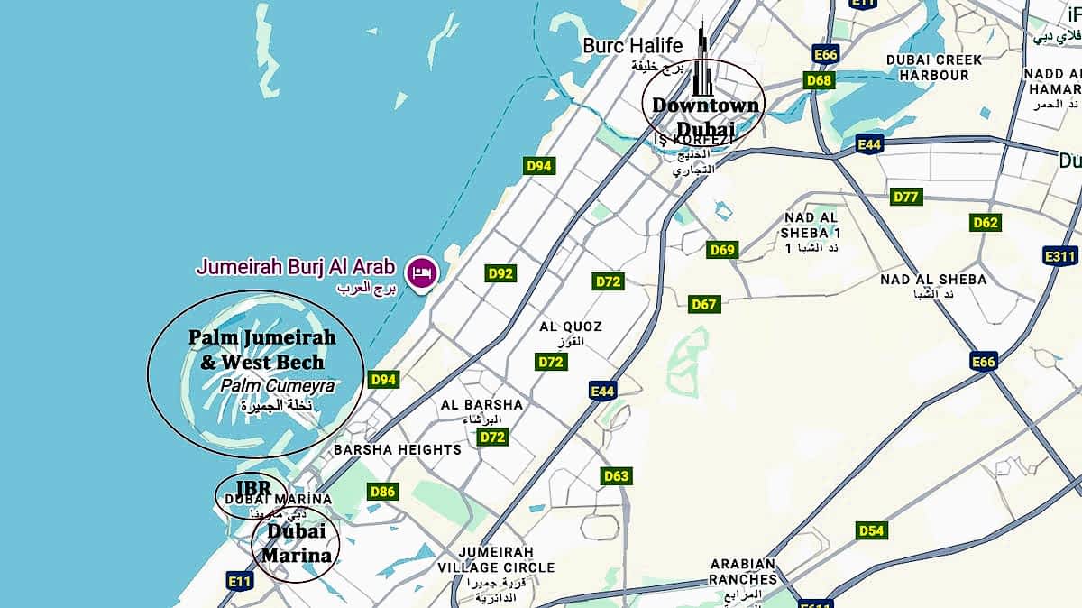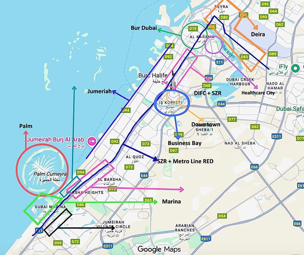 Dubai’ye ilk gez gittiğinizde hangi mahalle neresi karışık gelebilir. Gözünüzde canlandırabilmeniz için bölgelerin isimlerini harita üzerinde işaretledik. Aşağıda da bölgelere göre düzenlenmiş şekilde gezilecek yerler önerilerimizi bulacaksınız.