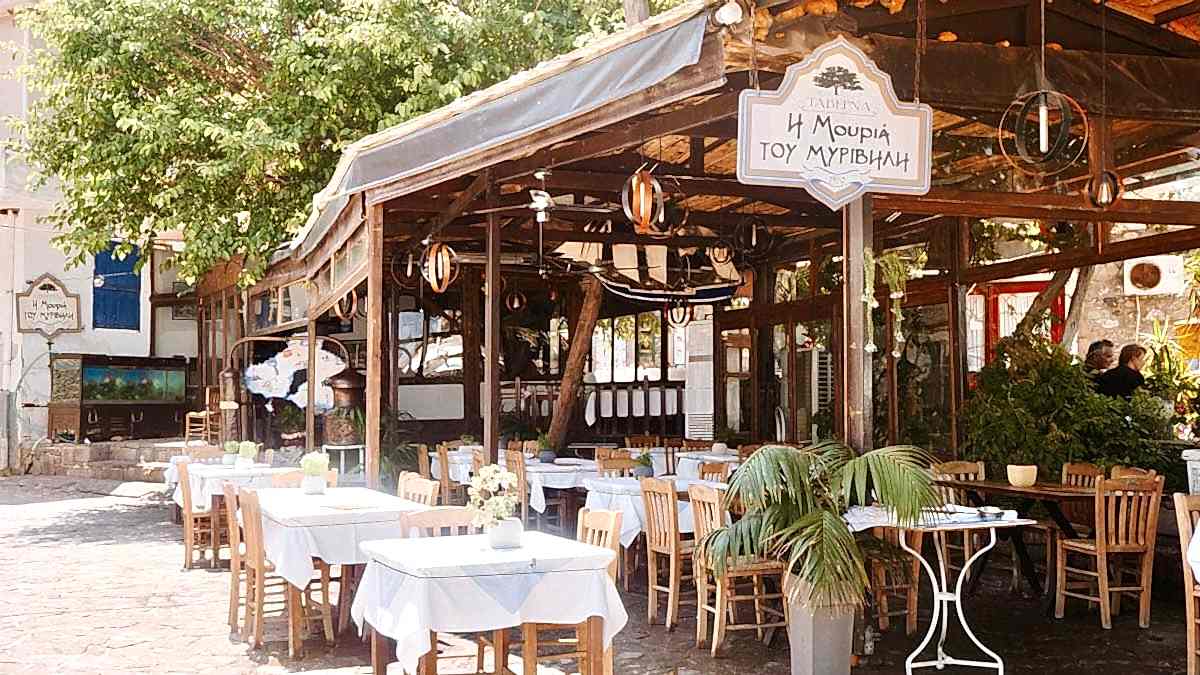 – I Mouria tou Mirivili, Skala Sikamineas: Skala Sikamineas’ın ünlü restoranı. “Mirivilis’in dut ağaçları” anlamına gelen ismi Midillili yazar Stratis Mirivilis’ten geliyor. Panagia Gorgona kilisesini de gören bir liman manzarasına sahip. Kalloni sardalyası, karides saganaki ve ahtopot ızgarası ünlü. için tıklayın. Haritada 44 numara.