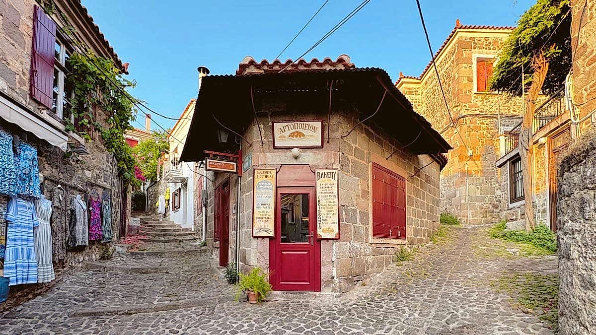 – Bakery, Molyvos: Molyvos Kalesi’ne çıkan sokakların birinde, tarihi bir taş binada bulunan yerel fırın. Ekmekten kruvasana, tarçınlı çörekten turtalara çeşit çeşit unlu mamule sahip. için tıklayın. Haritada 37 numara.