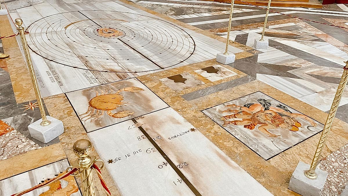 Fakat bu bazilikayı en ilginç kılan şey 12° 30′ Doğu boylamında Roma’yı kesen meridyen üzerine inşa edilmiş ve meridyen boyunca da Bianchini’nin güneş saatinin bazilikanın tabanına yerleştirilmiş olması. Yaz ayları gündönümünde yani 21 Haziran’da, güneş en yüksekte görünüyor, ışınları duvara en yakın noktada meridyen çizgisine çarpıyor. Kış gündönümü 21 Aralık’ta ise en uzak noktada kesiyor. Her iki ekinoksta da güneş tam meridyen çizgisine değiyor. için tıklayın. Haritada 42 numara.